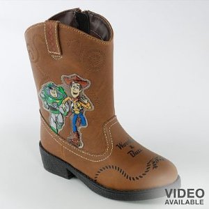 He'll lasso some fun in these toddler boys' Toy Story® light-up Western boots. In brown. * Faux-leather upper withstands daily wear and tear. * Buzz Lightyear and Woody applique adds playful appeal. * Light-up design provides extra safety and fun. * Side zipper and collar loops ensure easy on and off. * Padded footbed and lining cushion every step. * Rubber outsole keeps him on his feet. * Details: o 1-in. heel o Faux-leather upper o Rubber outsole